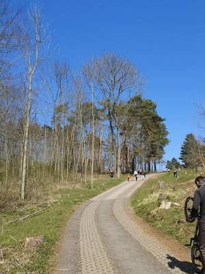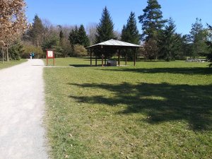 Startujeme dole pod kopcem na bílé čáře na asfaltu, cíl je na červené turistické značce na altánu.
