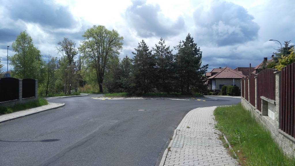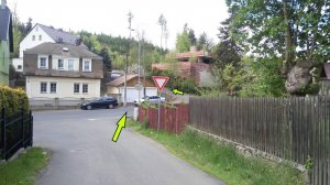 Žlutá značka pokračuje po silničce za závorou a další kilometr se po ní klesá do obce Hůrky, na Pražské silnici se odbočí doprava a hned se z ní zase uhne doleva. Zde je důležité dávat pozor na značku, na první vidličce se běží doleva, ale po dalších 200 metrech odbočuje žlutá nenápadně doprava do kopce po malé pěšince (viz foto). Ta Vás dovede k Hvězdárně, odkud se běží 1,1 km po silnici - v obci u kontejnerů na tříděný odpad se nejprve odbočí doleva, pak na kruhovém objezdu prvním výjezdem a na hlavní silnici U Rybníčka se pokračuje ještě 200 metru doprava, než se za svodidly odbočí ze silnice pryč.